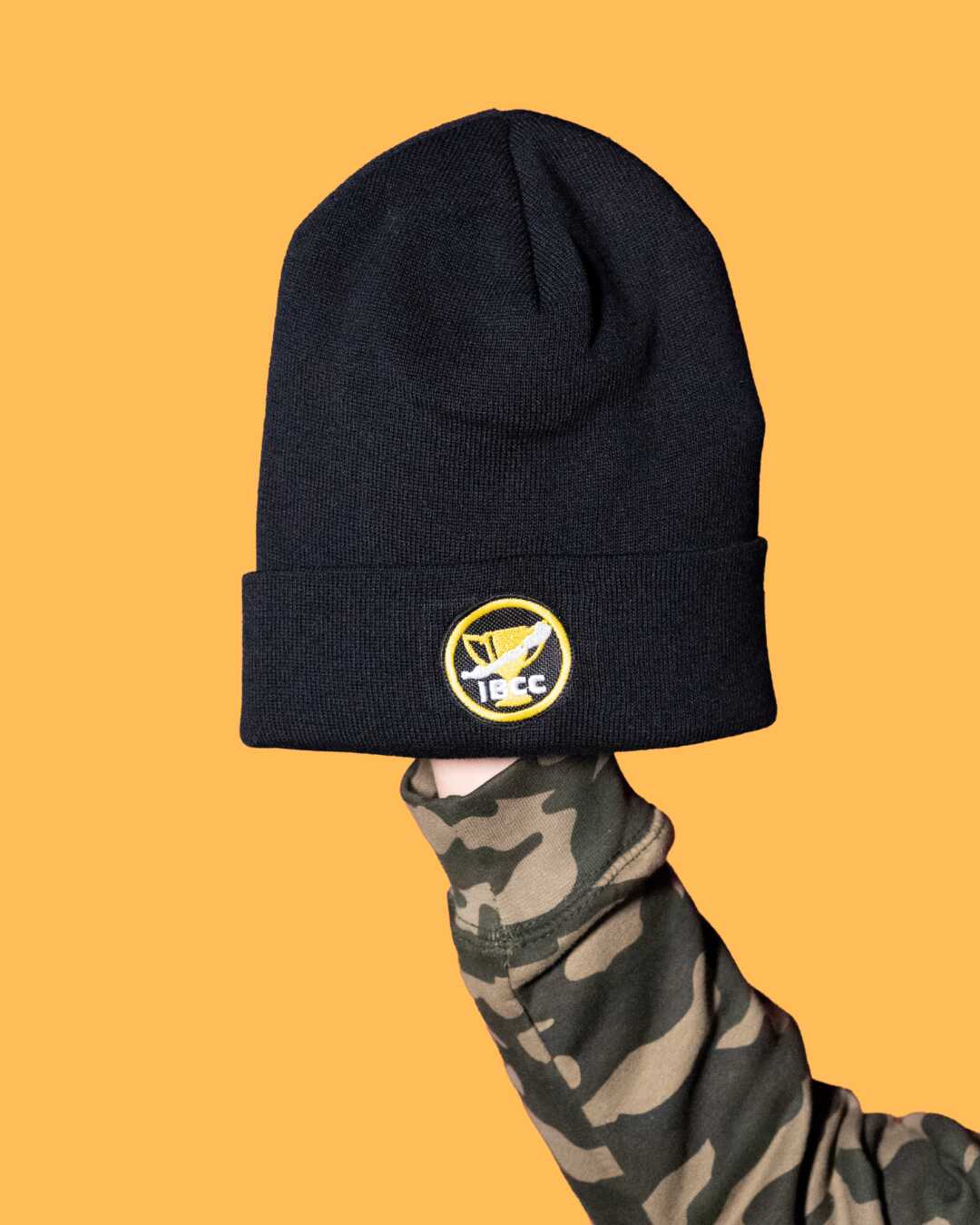 Fekete kötött sapka elől hímzett logóval.